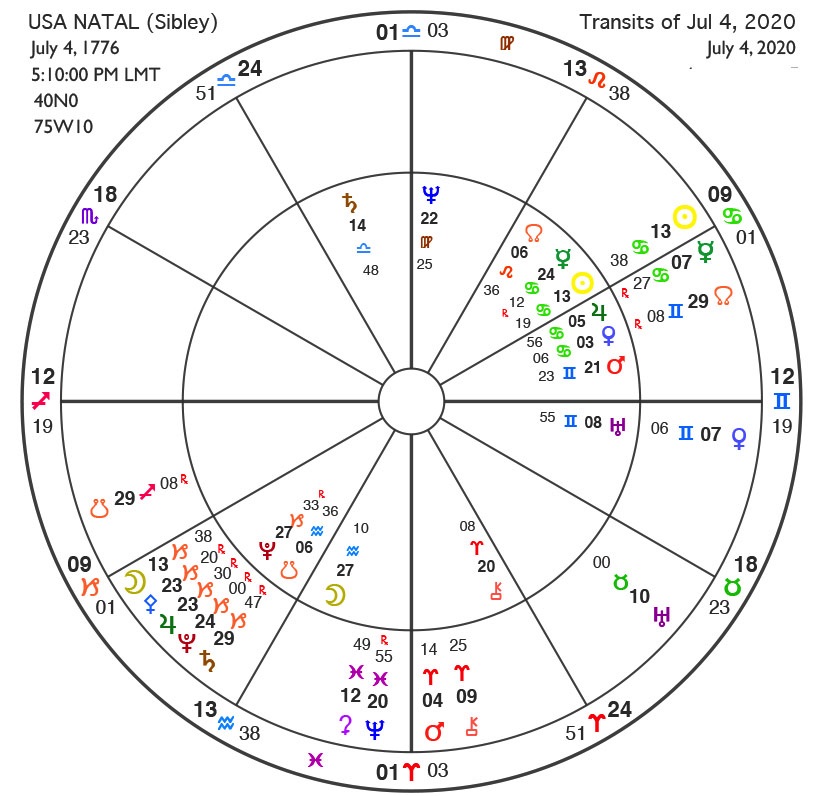 Eclipses, first of all, are cosmic exposers of whatever is hidden, they charge and activate our shadow contents. This one falls on the 13˚mark, that same degree as the Sun in the birth chart of the US. (See double wheel). The Sun indicates the identity in a person’s or a country’s birth chart. With an eclipse coming at a “Solar Return” this indicates a year in which the direction and definition of this country falls into deep questioning, an identity crisis. Certainly anyone looking at what’s happening now in the US would confirm this diagnosis, but for this to be the signature of the coming year, it augurs a year ahead, which has only just begun, of deep questioning of the stability and our essential integrity as a nation.