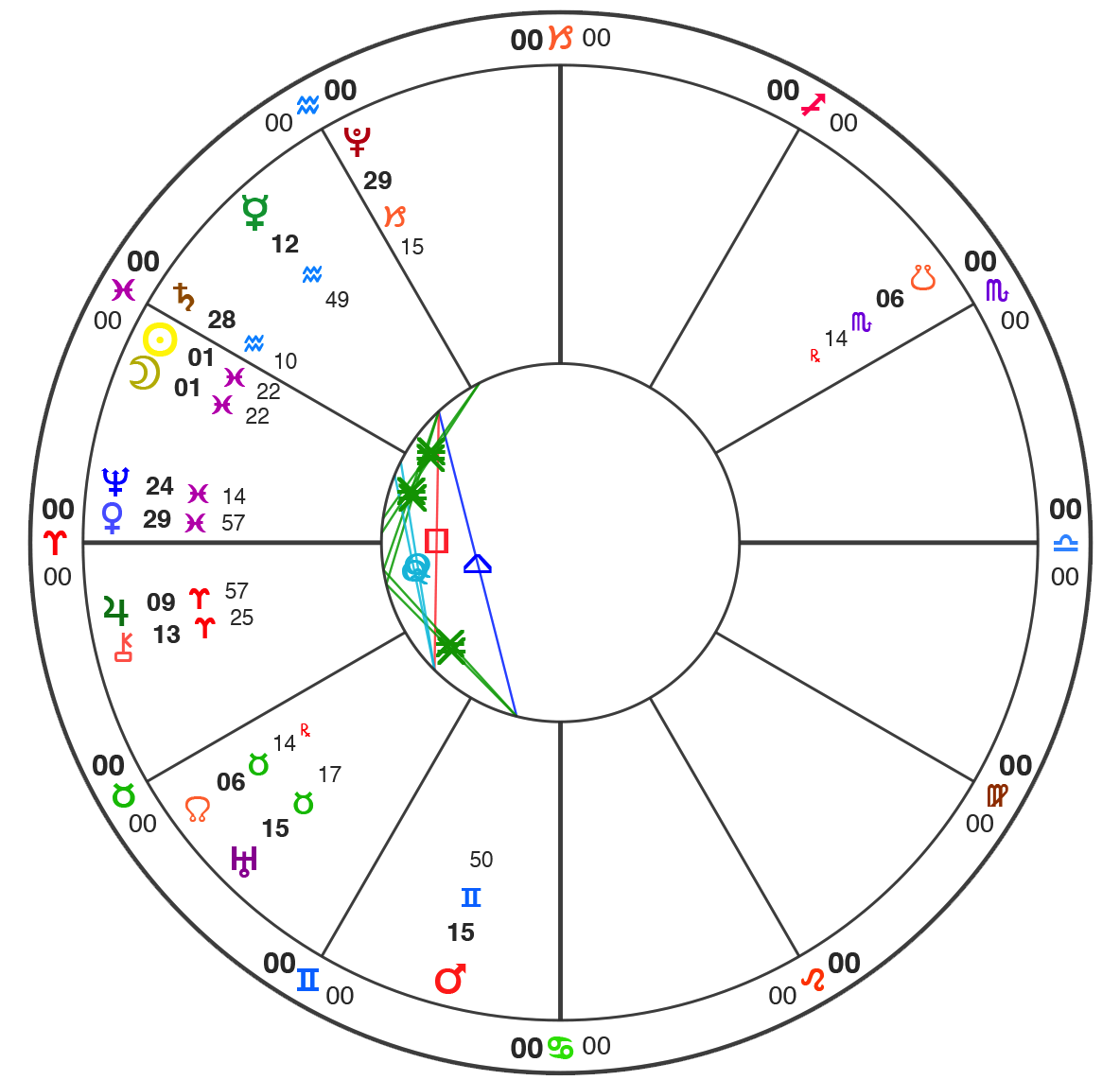 All charts here are using Natural House system: i.e. the Ascendant is always at 0˚ of Aries.