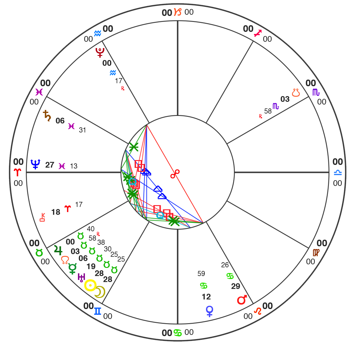 All charts here are using Natural House system: i.e. the Ascendant is always at 0˚ of Aries.