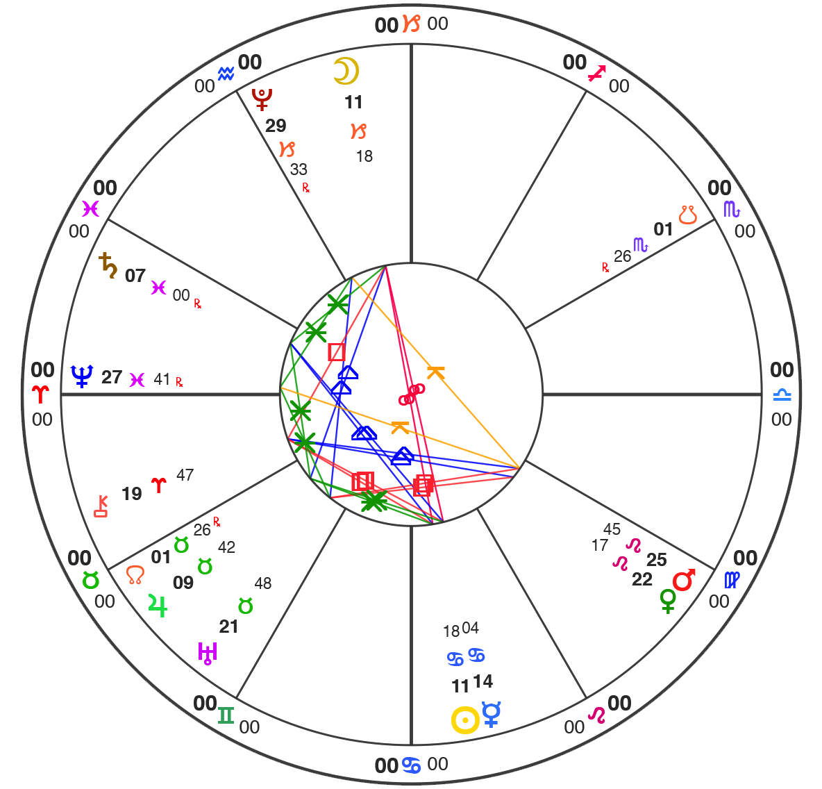 All charts here are using Natural House system: i.e. the Ascendant is always at 0˚ of Aries.
