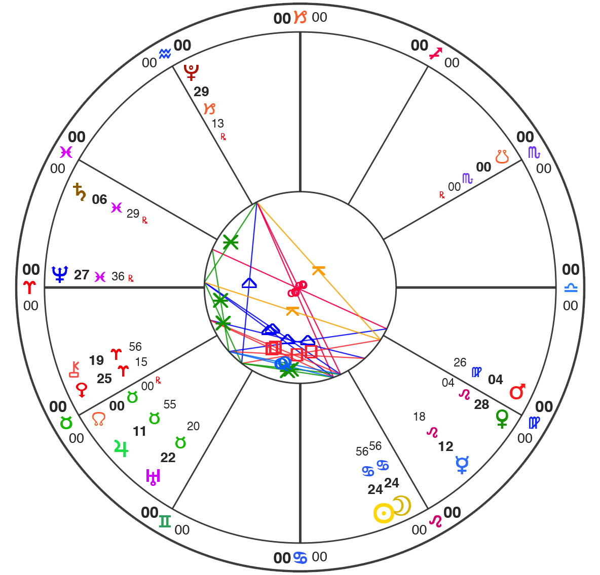 All charts here are using Natural House system: i.e. the Ascendant is always at 0˚ of Aries.