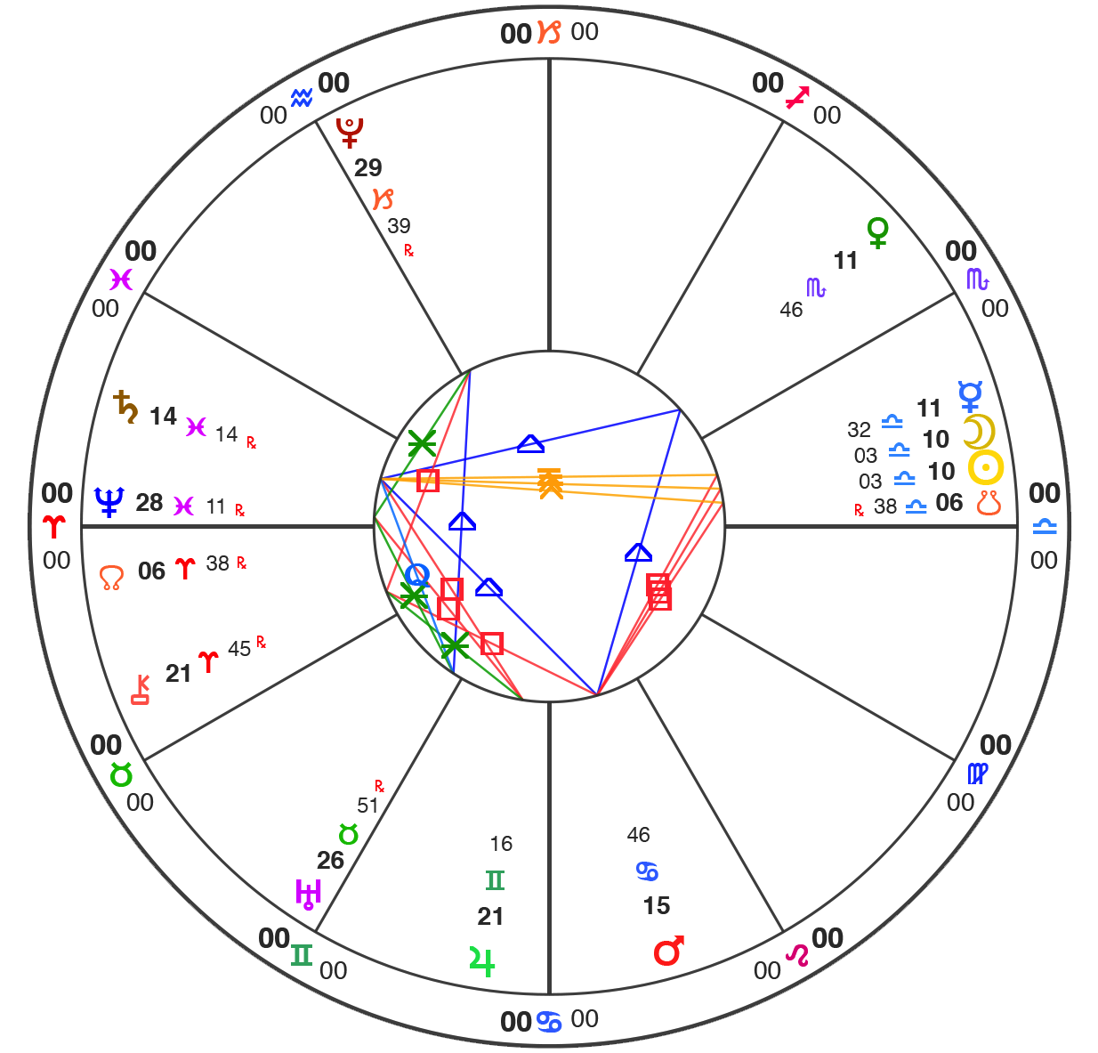 Adding to the emotionality of this chart (which is lacking any major planets in fire signs) is a Grand Trine in water signs: Venus in Scorpio, Mars in Cancer, and Saturn in Pisces. Here is a powerful planetary placement that highlights an intensity and fervor which the energetics of the eclipse magnifies, and brings out the shadow of our emotionality to above the surface, into the public eye. It’s a very shadowy emotionality, as Venus in Scorpio is in its detriment, opposite the sign of Taurus which it rules, and Mars also is in its “fall” opposite the sign of its exaltation in Capricorn. These categories are not good or bad judgements, but are ways of illustrating that a planet’s usual strengths are not employed in these signs, but must be “worked’ to overcome possible awkward tendencies toward unconscious manifestations, given they are in a polarity sign that’s opposite to their easiest expression.