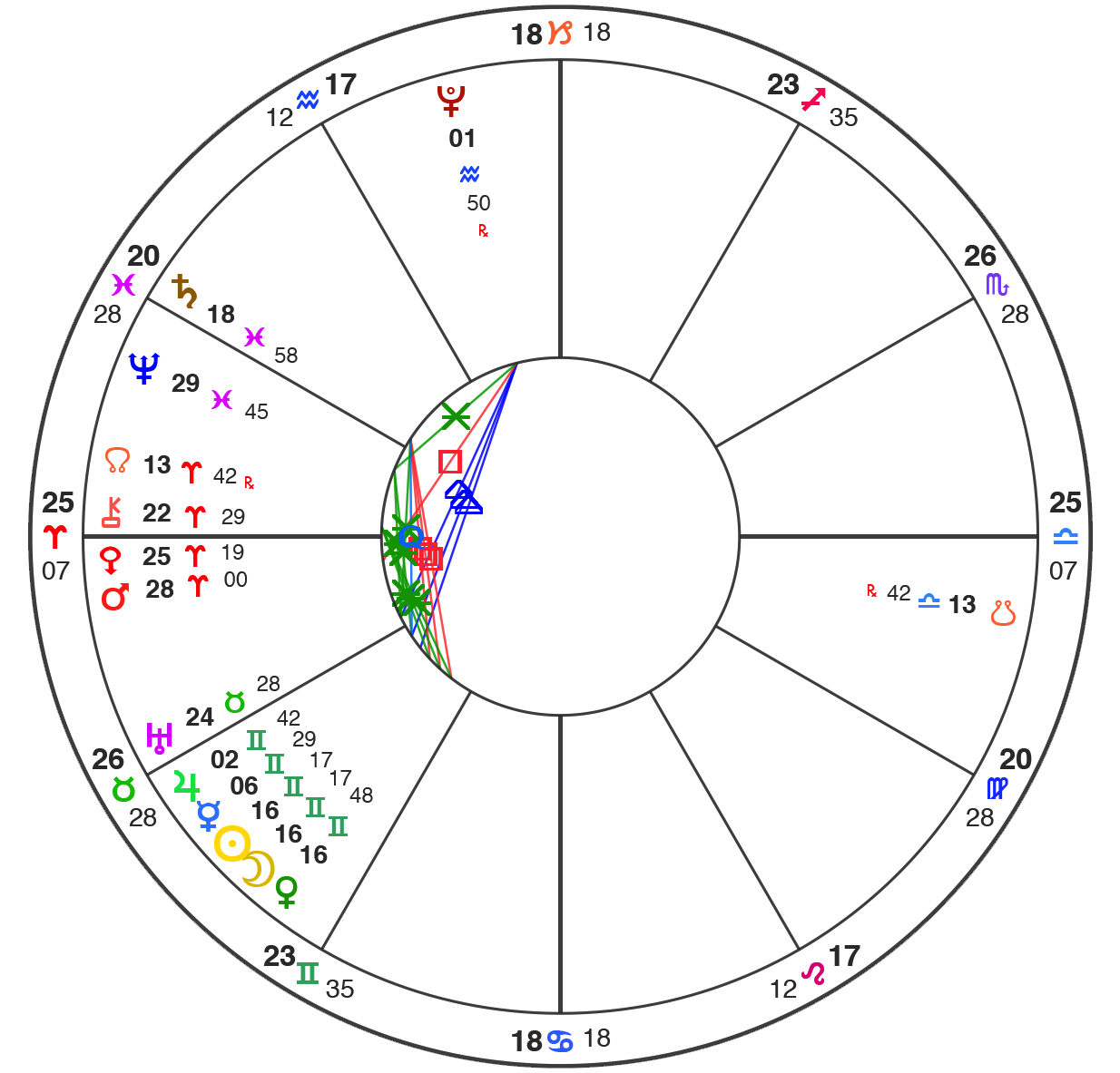 This kind of investigation is more of a spiritual quest, and that can be a lifetime of work. Saturn in this New Moon chart forms a square (a 90˚ angle) to the Sun/Moon as well as to Venus. Squares challenge us to use that energy wisely, to look before we leap. Saturn in Pisces asks us to examine ourselves in the light of what we believe are our deepest truths. Do our thoughts about ourselves and the world around us lead to cynicism or self-judgement? Does that help to fulfill our greatest good?