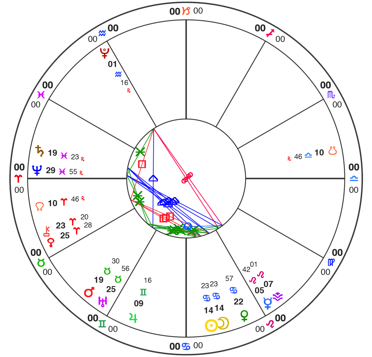 All charts here are using Natural House system: i.e. the Ascendant is always at 0˚ of Aries.