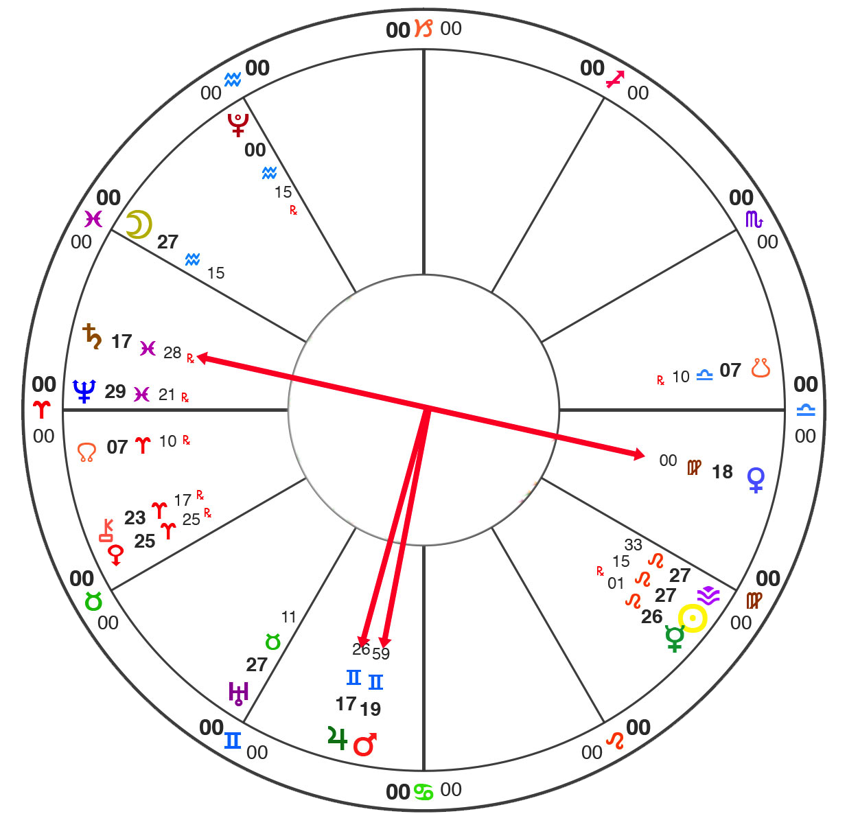 The second T-square is in mutable signs, Saturn in Pisces, Venus in Virgo and Mars/Jupiter in Gemini, which is the focal point. Mars and Jupiter together happens every 2-3 years, but these two haven’t been together in Gemini since 19892, and even then it was at the very beginning of that sign at 0˚ 02’. Before that, they were conjunct at this degree3 of conjunction in 1942, in the middle of WW2. Mars amplifies wherever it transits, and with Jupiter’s penchant for expansion, our brains are quickened now as never before as Gemini rules our thoughts and perceptions.