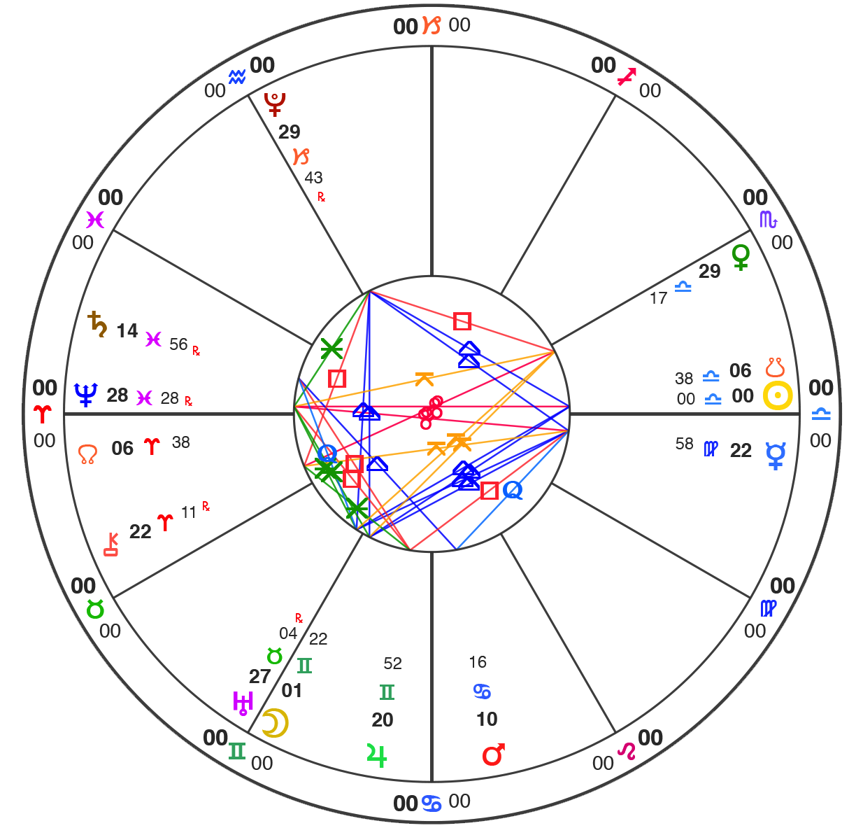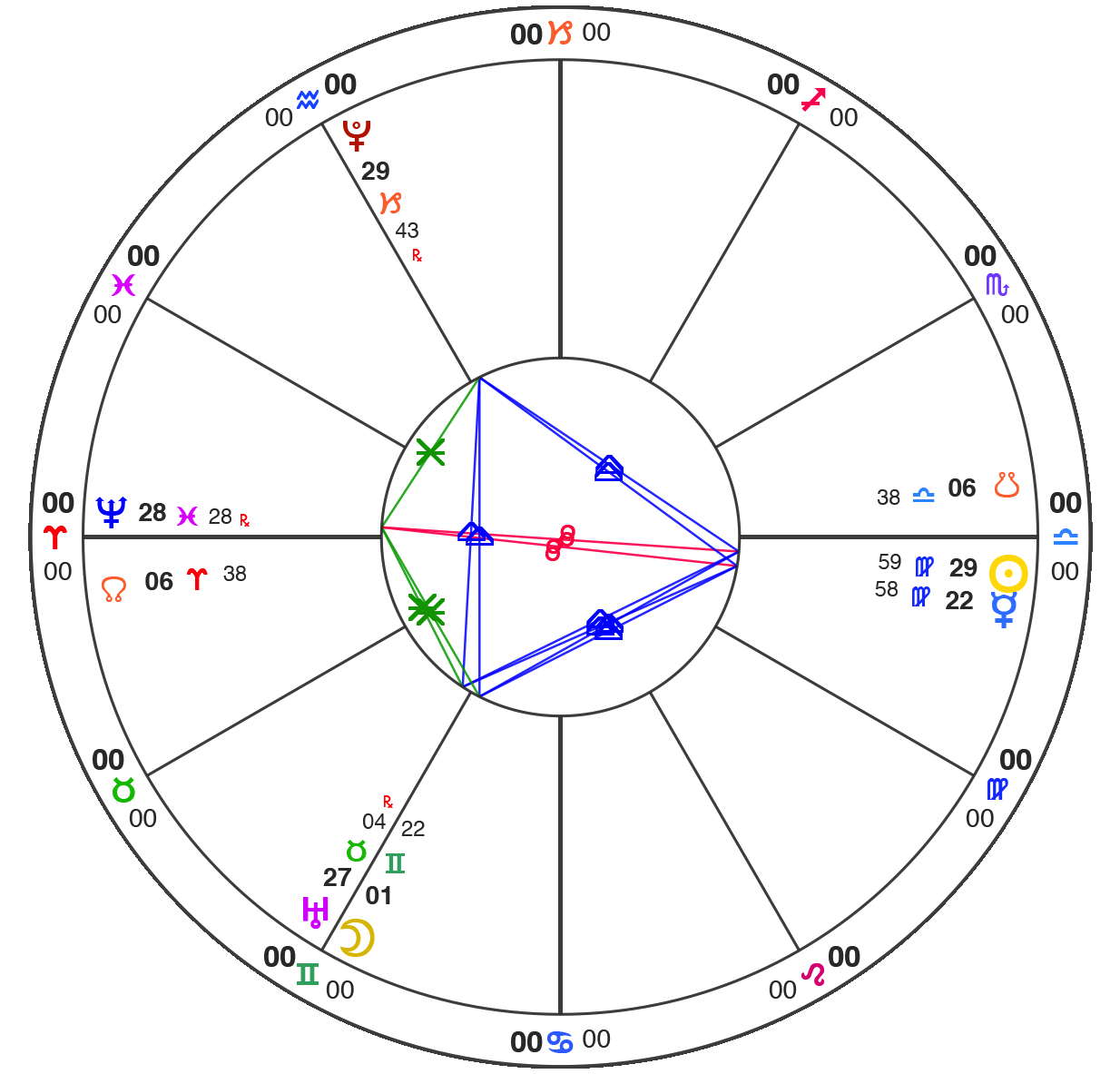 All charts here are using Natural House system: i.e. the Ascendant is always at 0˚ of Aries.