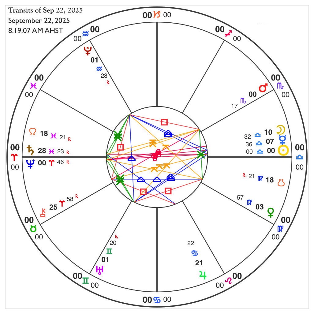 Equinox and Solstice charts are important, because they occur at pivotal points in the Earth’s journey around the Sun, and they show us the kinds of influences that will be in play for the next three months. These are “mundane”1 charts, ones which cover influences for large groups of people, and show us a map of the general trends and energies at work for all of us. So what can we expect this autumn leading up to the Winter Solstice?