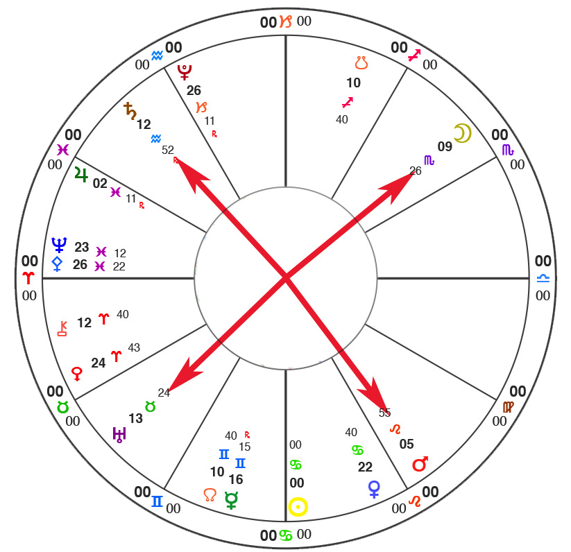 This chart has two major astrological features in it: a Grand Cross, and a Grand Trine.