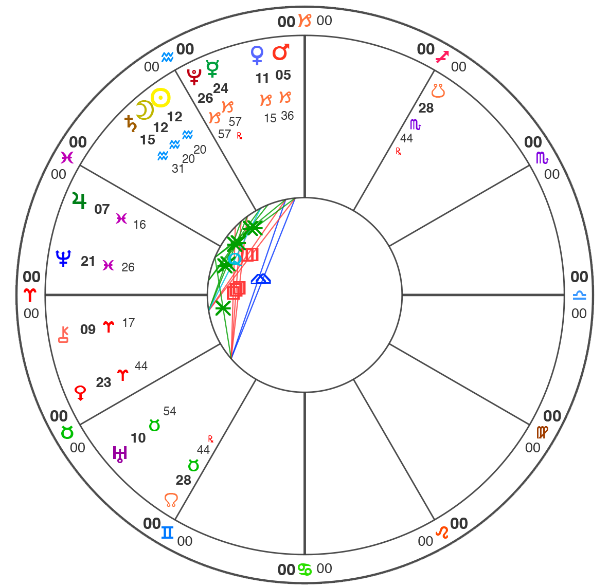 All charts here are using Natural House system: i.e. the Ascendant is always at 0˚ of Aries.