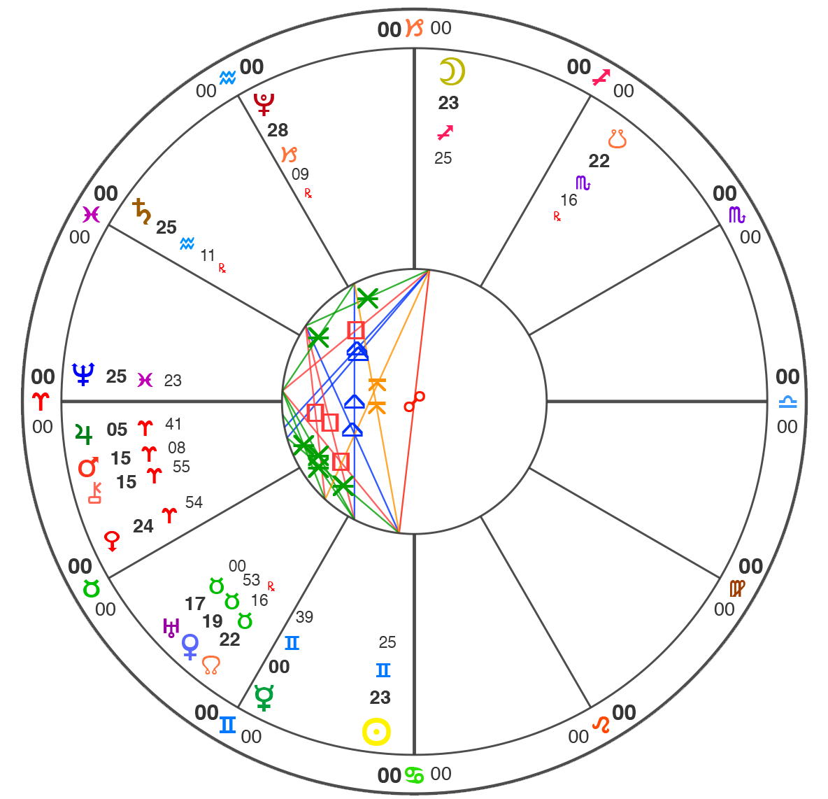 All charts here are using Natural House system: i.e. the Ascendant is always at 0˚ of Aries.