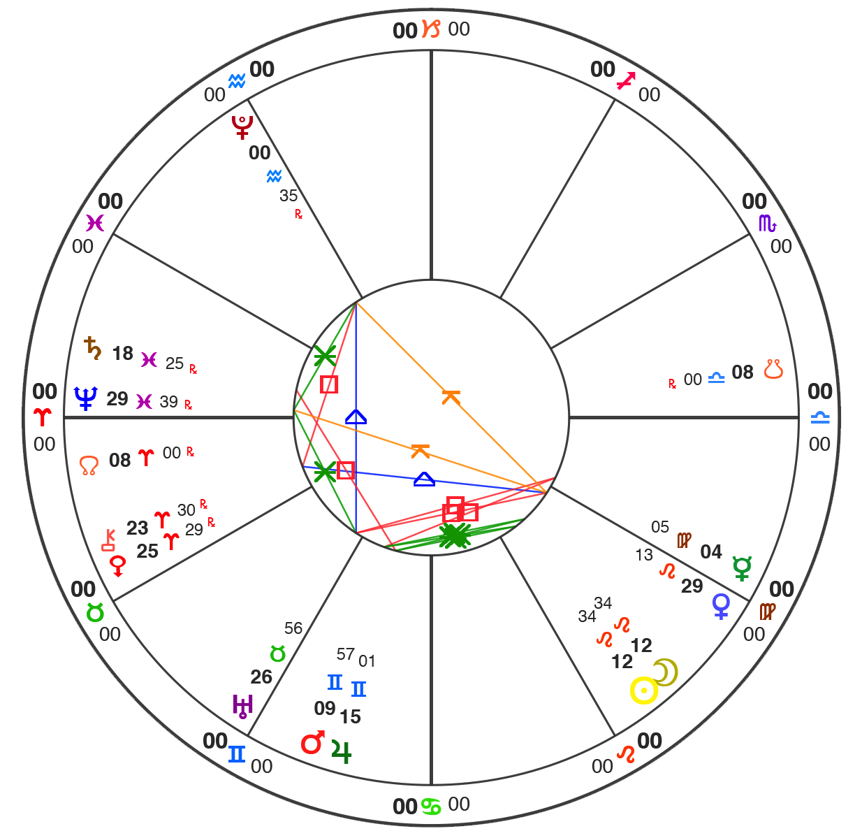 All charts here are using Natural House system: i.e. the Ascendant is always at 0˚ of Aries.
