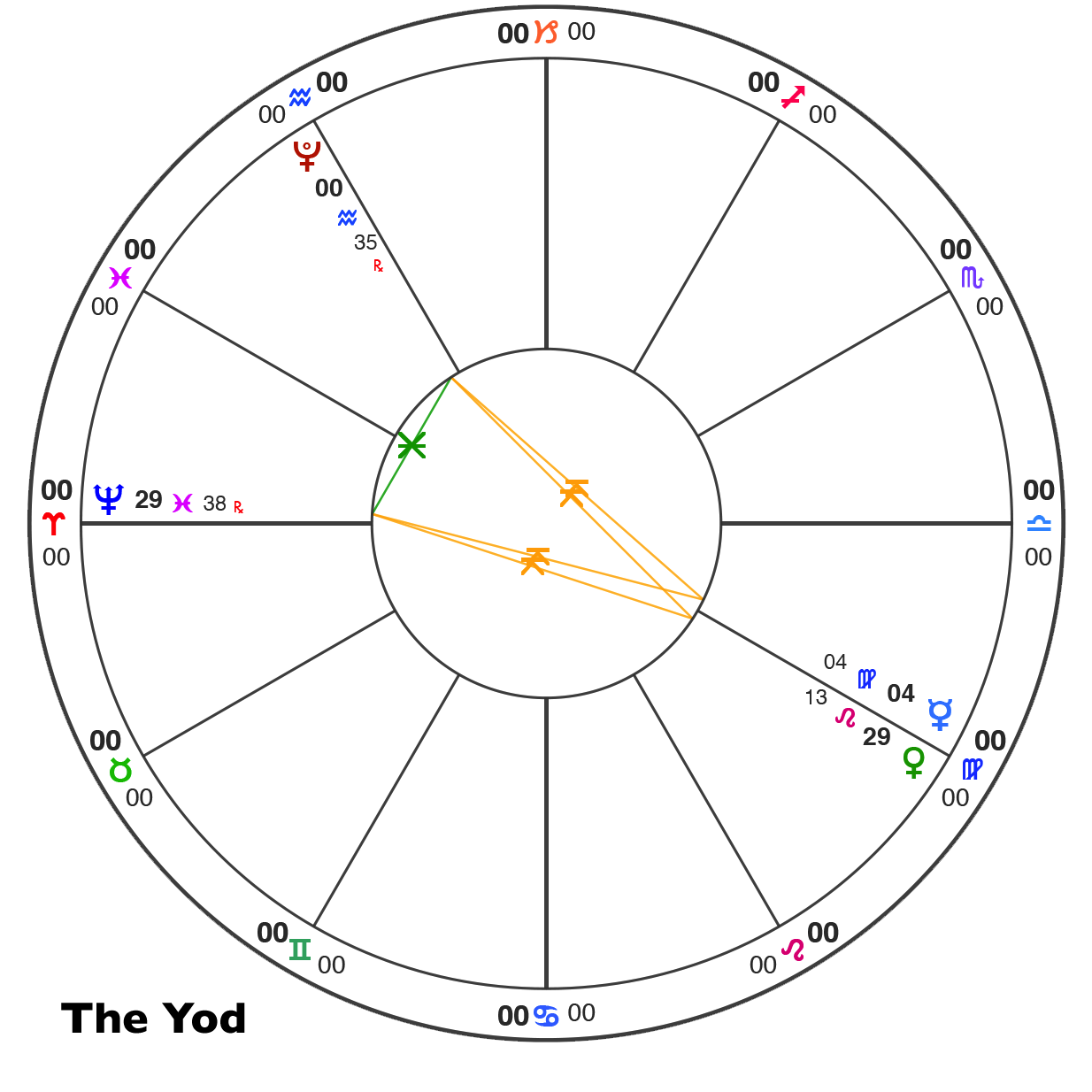Venus at the last degree of Leo is at the sensitive tip of this Yod, and is asking us to look deeply at our Feminine energy, and find there a deep respect for its innate ability to bring us in alignment with our creativity, our life force, and hence bring a sense of balance to our daily lives.
